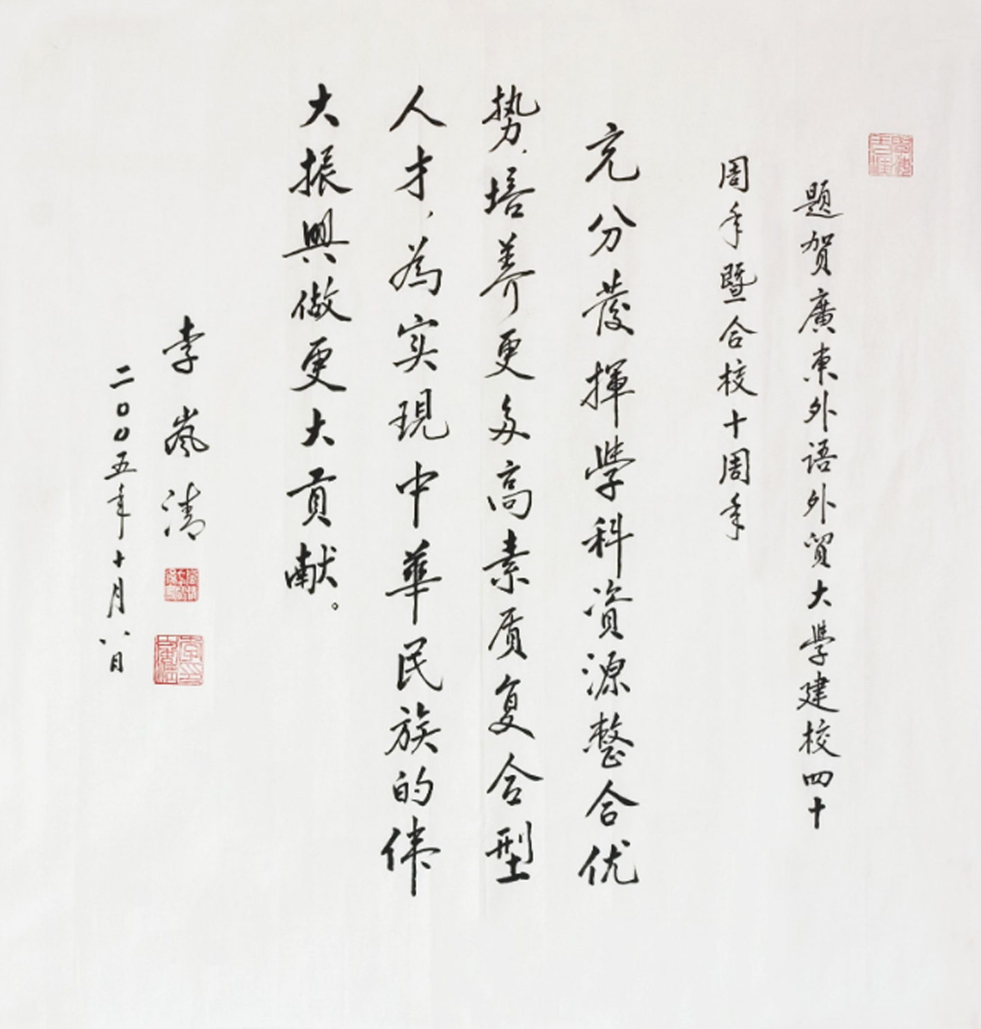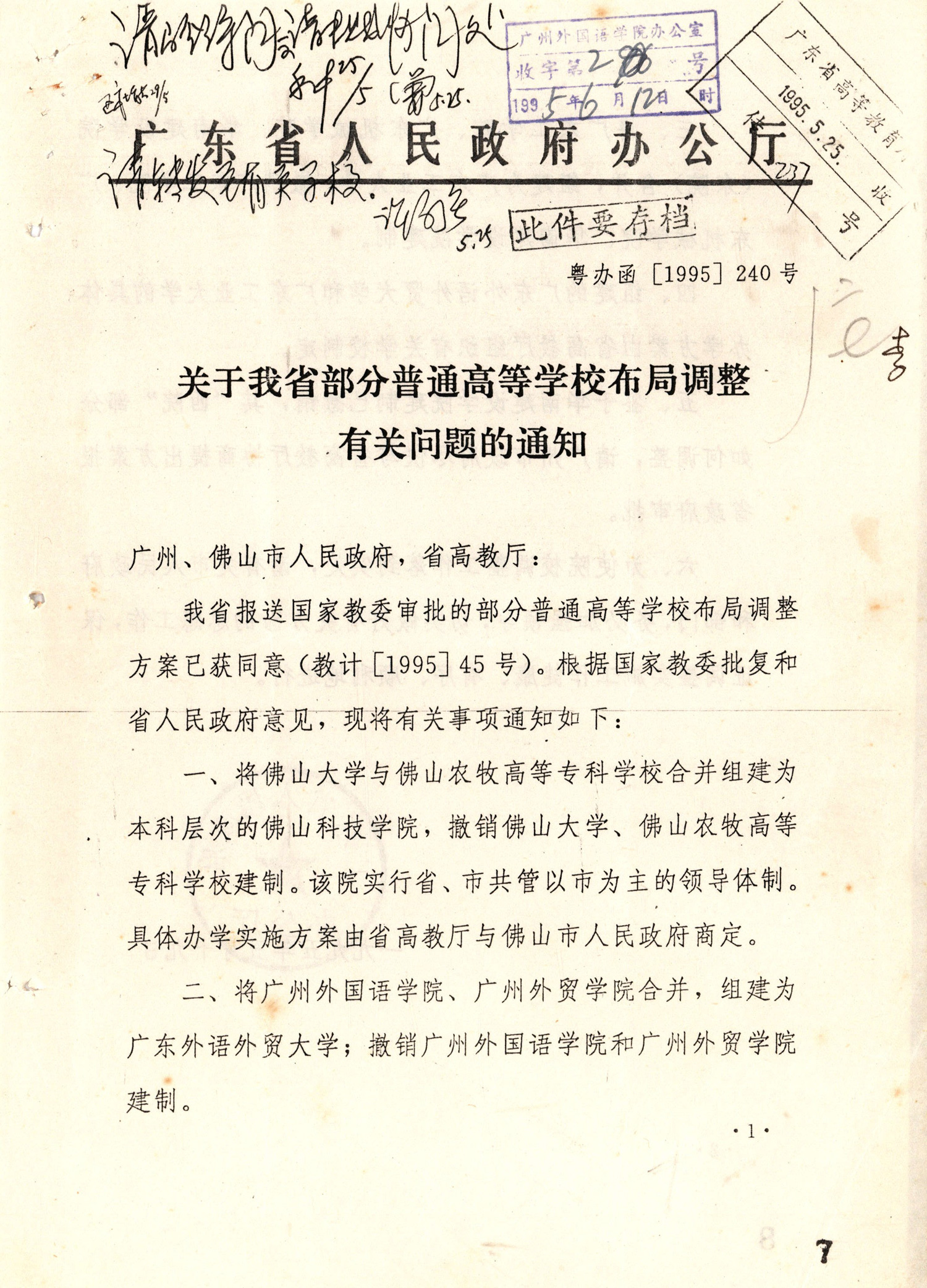1995年5月,为顺应教育体制改革,适应形势发展需要,广州外国语学院与广州对外贸易学院合并组建广东外语外贸大学。新大学不断扩大办学规模,力推管理体制“五项改革”和“新五项改革”,建设大学城校区,深化内涵、提升办学质量,完成了从单科型院校向多学科综合型大学的转型,走出了一条具有鲜明特色的跨越式发展之路。